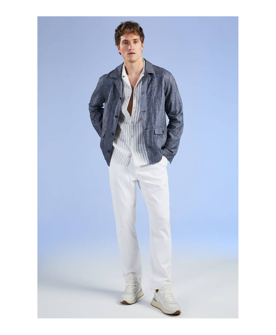 Pantalone lungo uomo in cotone stretch con struttura cinque tasche e chiusura zip e bottone. Vestibilita slim ideale per look casual contemporaneo