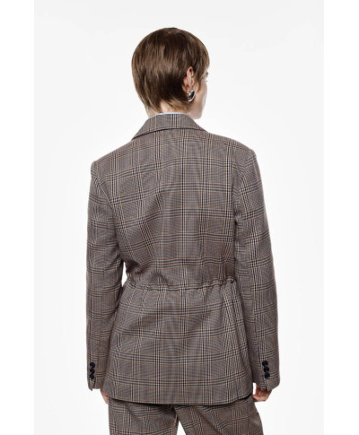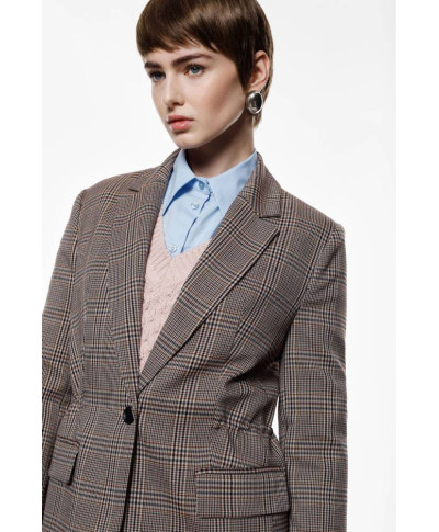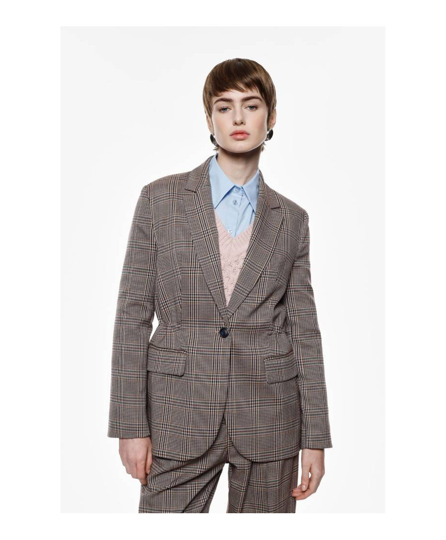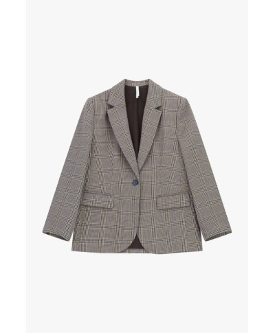 Giacca blazer monopetto ampia a quadri caratterizzata da una stampa check e tasche a pattina, ideale per un guardaroba metropolitano e versatile. Il taglio strutturato e la chiusura a un bottone lo rendono adatto a look sofisticati ed espressioni individuali sia nella vita lavorativa sia nel tempo libero. Composizione: 65% poliestere, 32% viscosa, 3% elastan.