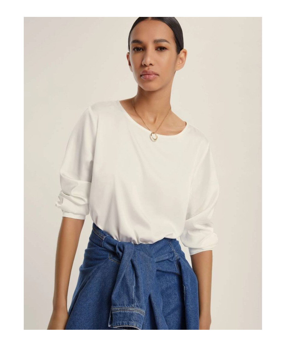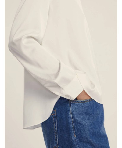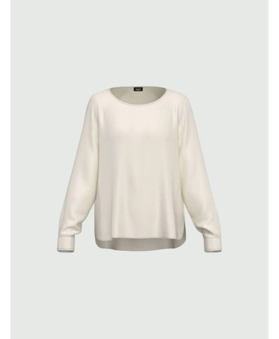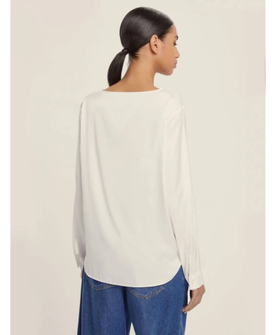 Blusa in raso leggero di tessuto tecnico stretch. Fit dritto. Scollo a barca. Maniche lunghe con polso e bottone. Fondo stondato con linea asimmetrica.