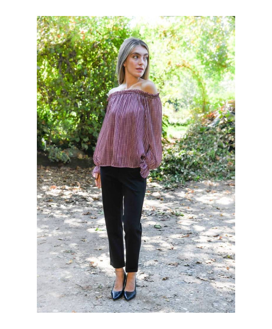 Blusa con spalla scesa. Composizione: 95% viscosa, 5% elastan.