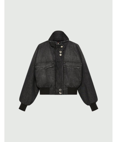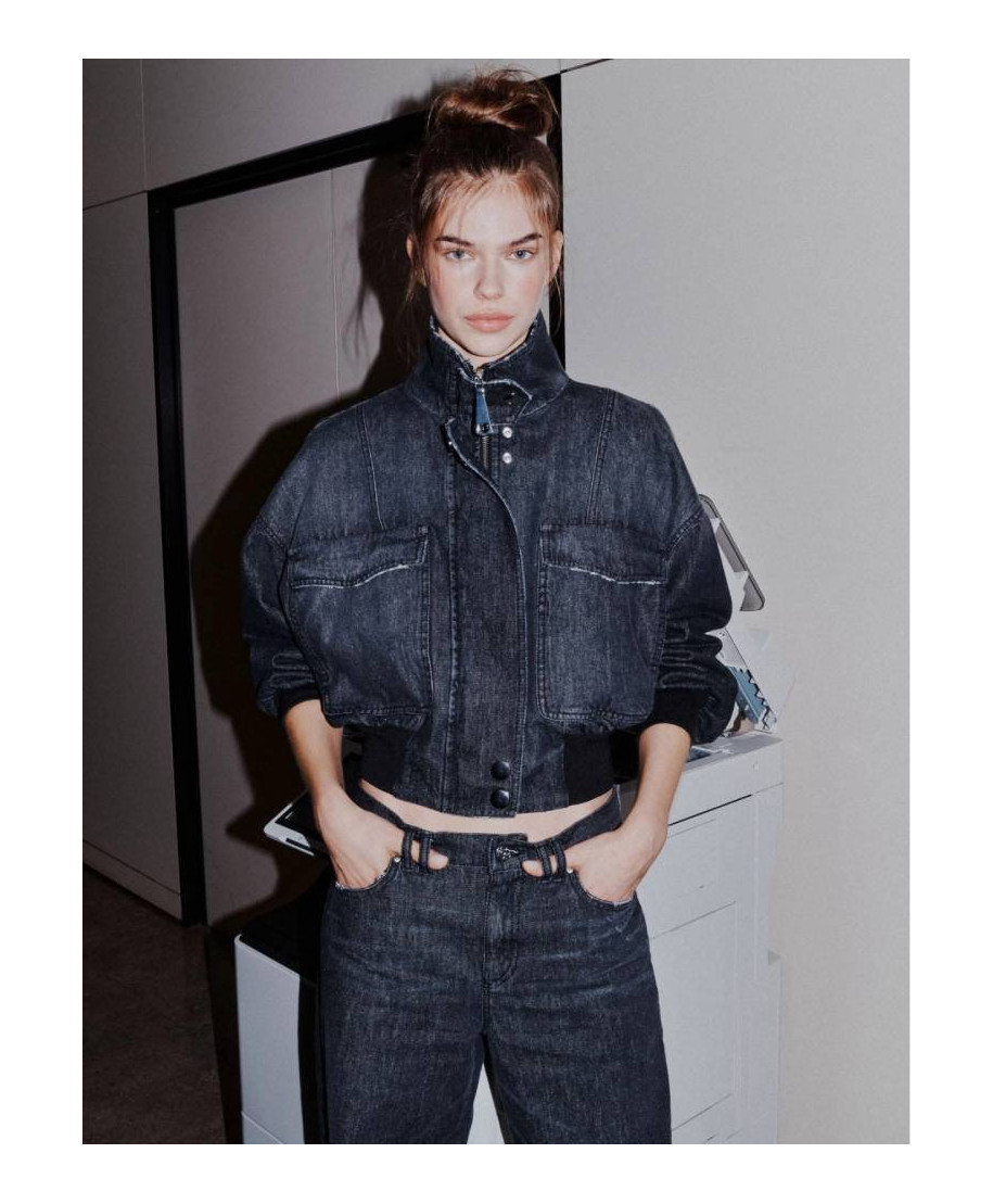 Bomber in denim di puro cotone. Fit femminile, con linea over sulle spalle e taglio crop in vita. Collo rialzato con paragola. Chiusura con zip nascosta e tiretti lunghi. Maxi tasche applicate con bordo tagliato a vivo e fondi in maglia a costine. Modello appartenente alla speciale collezione Marella Codesign in collaborazione con Stella Maxwell