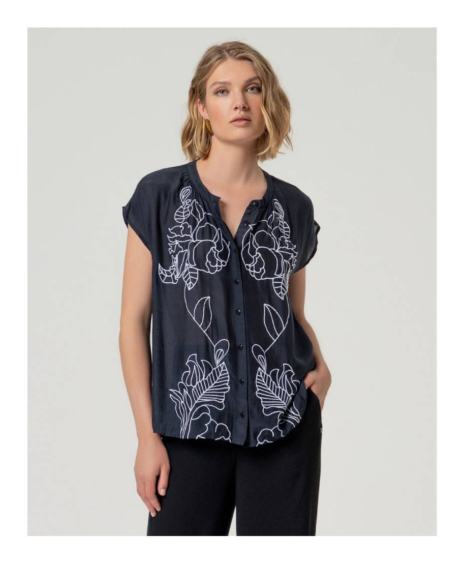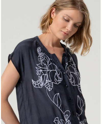Camicia ricamata donna senza maniche con dettaglio decorativo. Perfetta per look estivi dal carattere deciso.