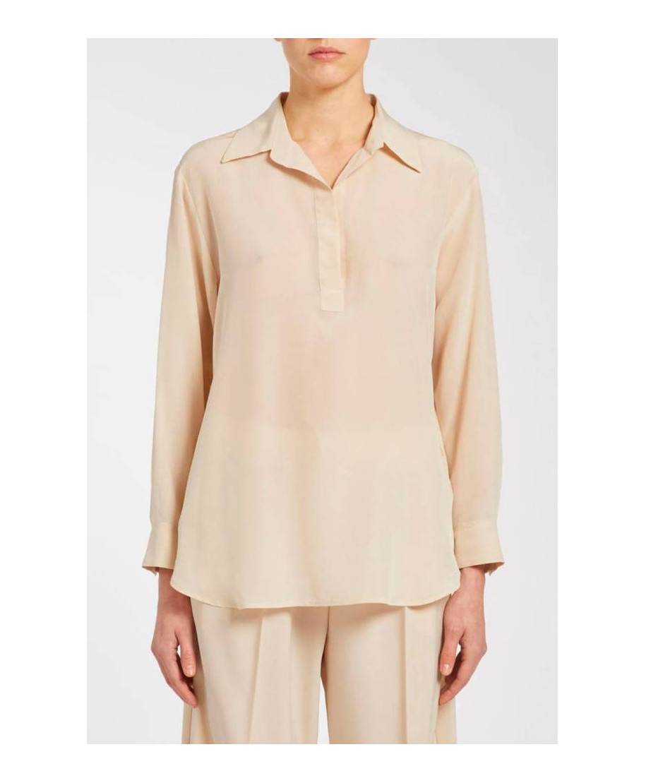 Camicia in cre de Chine di pura seta. Fit dritto. Collo a polo con apertura a V. Polsino con bottoni. Carrsul retro. Fondo stondato con spacchetti.