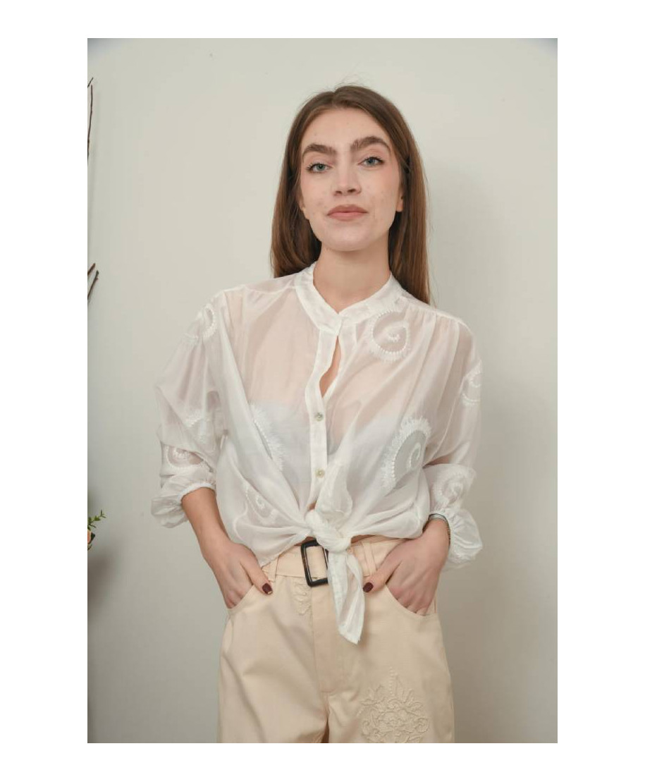 La camicia bianca crema ha un design minimalista con dei rilievi in rilievo dello stesso tessuto bianco. Questi rilievi creano un effetto texture interessante sul davanti della camicia, aggiungendo un tocco di dettaglio senza essere troppo appariscente. Colletto classico e maniche corte. Un pezzo versatile e raffinato, perfetto per un look elegante, ma non troppo formale. Composizione: 85% lyocell, 15% poliestere.