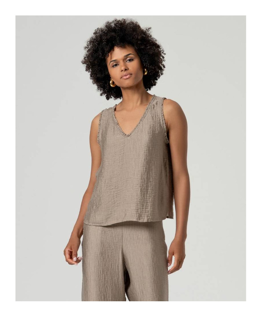 Top donna a spalline con scollo a v e design essenziale. Perfetto per outfit estivi semplici o sotto giacche leggere.
