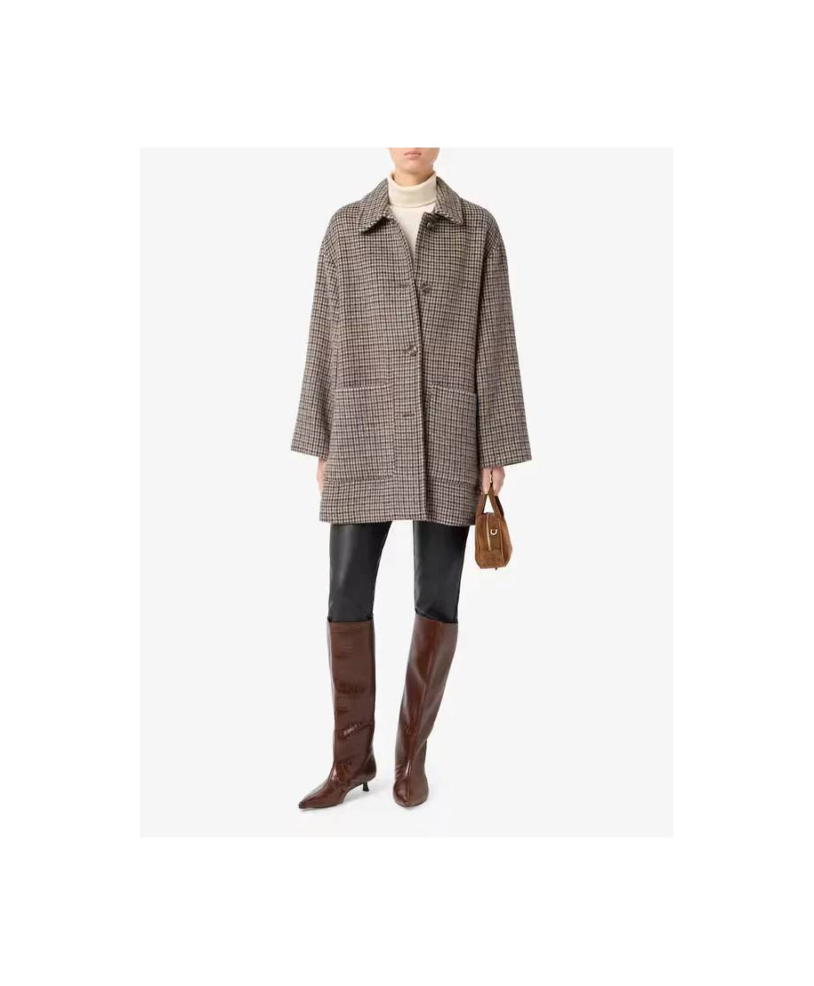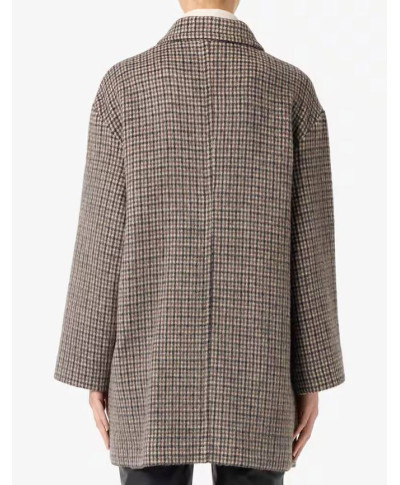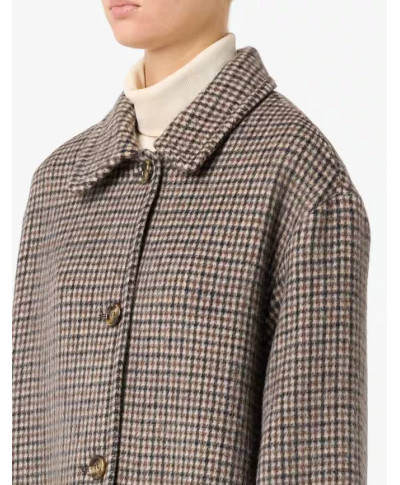Giaccone check in misto lana stretch. Collo a camicia con maniche lunghe e giro sceso. Chiusura con bottoni. Linea ampia, tasche applicate, sfoderato.