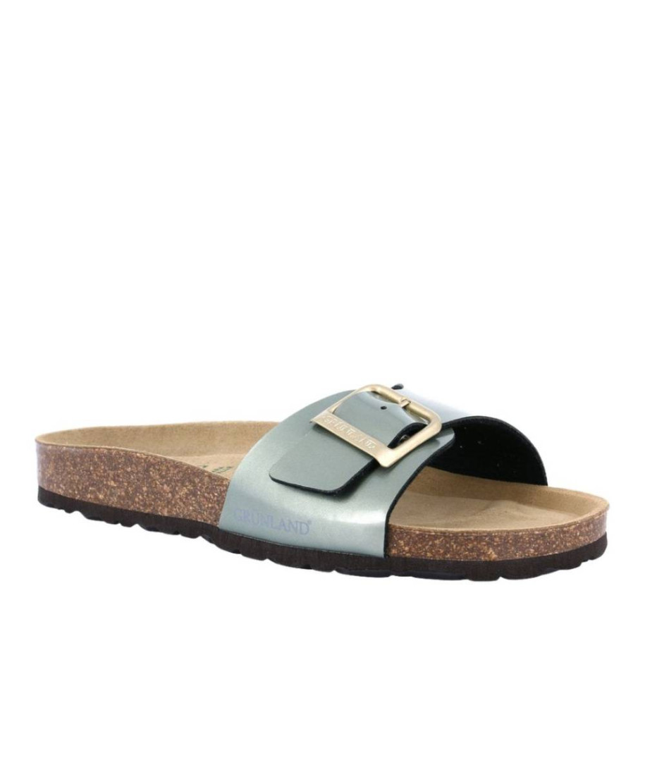 Ciabatta SARA con tomaia in materiale morbido e finiture dal gusto metallico. La suola leggera e il plantare anatomico garantiscono comfort immediato per luso quotidiano.