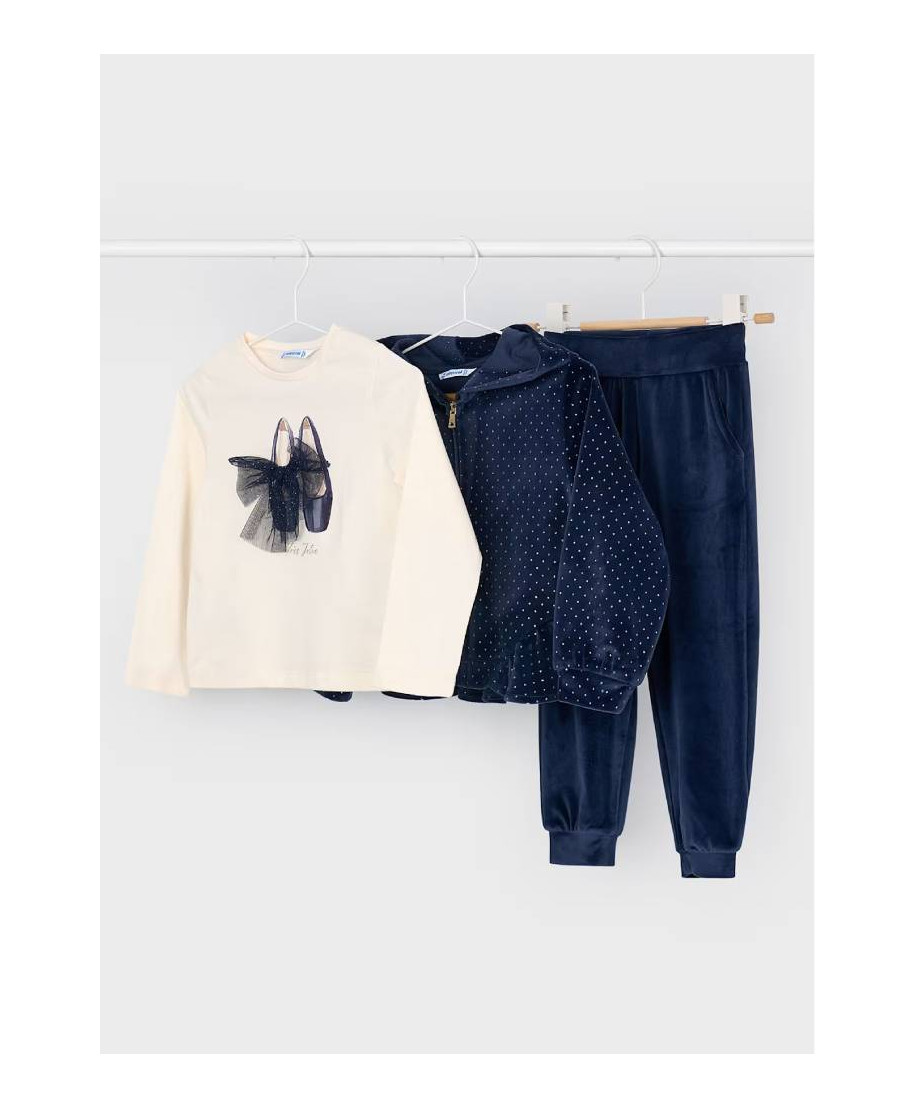 Tuta tre pezzi per bambina costituita da una felpa, un pantalone sportivo e una maglietta abbinati. Felpa manica lunga per bambina. Colletto con cappuccio. Chiusura centrale con cerniera. Elementi decorativi: volant decorativi. Maglietta manica lunga per bambina. Elementi decorativi: applicazione decorativa, Serigrafia (print). Pantalone per bambina della linea sporty, molto comodo. Elastico in vita. Orlo elasticizzato per una migliore vestibilit