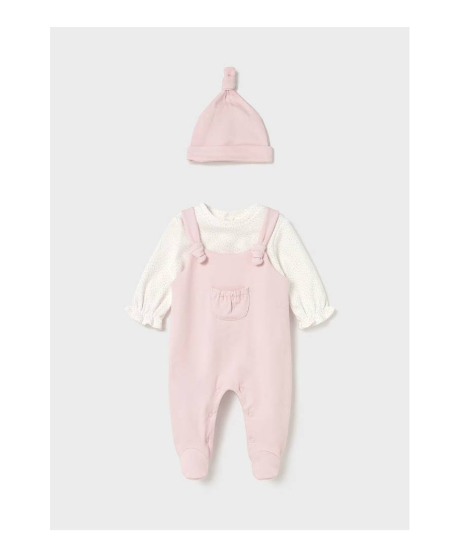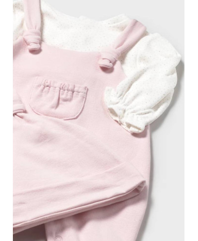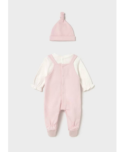 Completo due pezzi per neonata. Pagliaccetto manica lunga per neonato con polsini elasticizzati nella parte interna. Modello con finta salopette sovrapposta. Chiusura con bottoni a pressione nella parte posteriore. Chiusura con bottoni a pressione nell'interno cosce per agevolare la vestibilit Questo modello nelle taglie pigrandi (da 6-9 alla 18 mesi) non presenta i piedini al fine di agevolare i movimenti e rendere l'articolo picomodo. Dolce cappello per neonato. Elementi decorativi: fiocco.