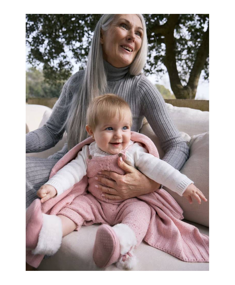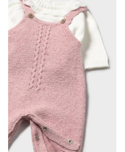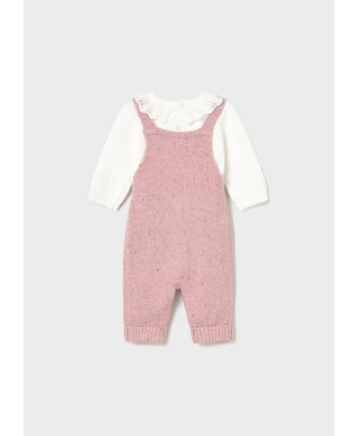 Completo per neonata. Tessuto in tricot morbido al tatto. Maglione manica lunga per neonata. Colletto con onde. Chiusura con bottoni a pressione nella parte posteriore. Salopette lunga con bretelle neonata. Le taglie grandi (dalla 6-9 alla 18 mesi) non sono dotate di questa apertura. Chiusura con bottoni.