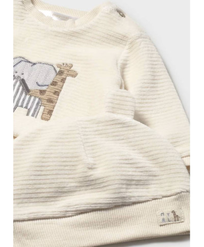 Completo per neonato tre pezzi. Felpa manica lunga per neonato. Girocollo. Bottone sulla spalla per facilitare la vestibilitdel capo. Elementi decorativi: applicazioni decorative, ricami. Pantalone per neonato della linea sporty, molto comodo. Elastico in vita. Tasche funzionali nella parte anteriore. Cappello neonato in tessuto caldo e flessibile che garantisce una vestibilitcomoda e protegge dal freddo. Elementi decorativi: applicazione orecchie.