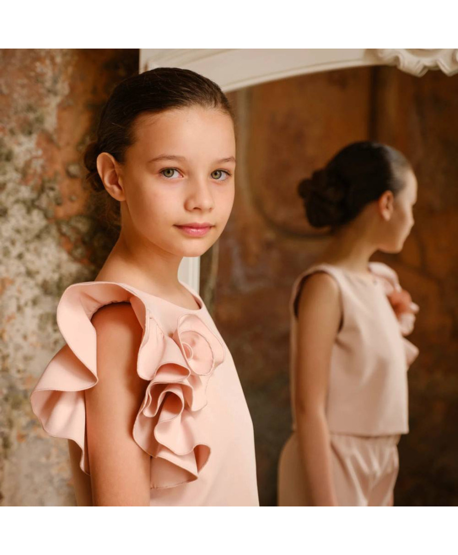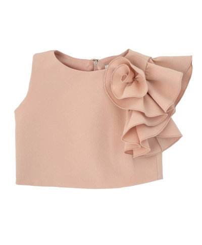 Completo elegante composto da top, con applicazione floreale decorativa, e pantalone dal taglio moderno e leggero. Ideale per creare outfit eleganti da cerimonia o casual chic con movimento e stile contemporaneo.