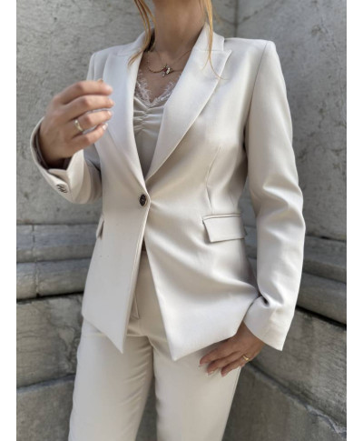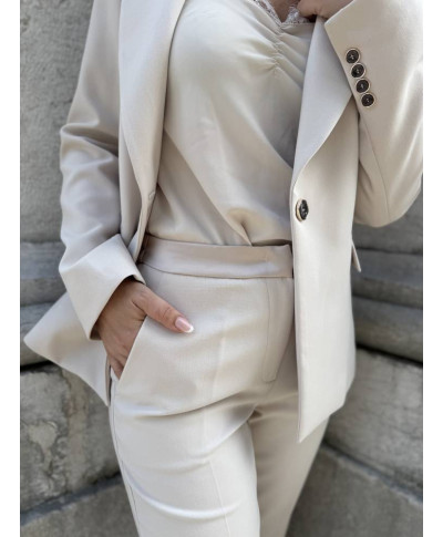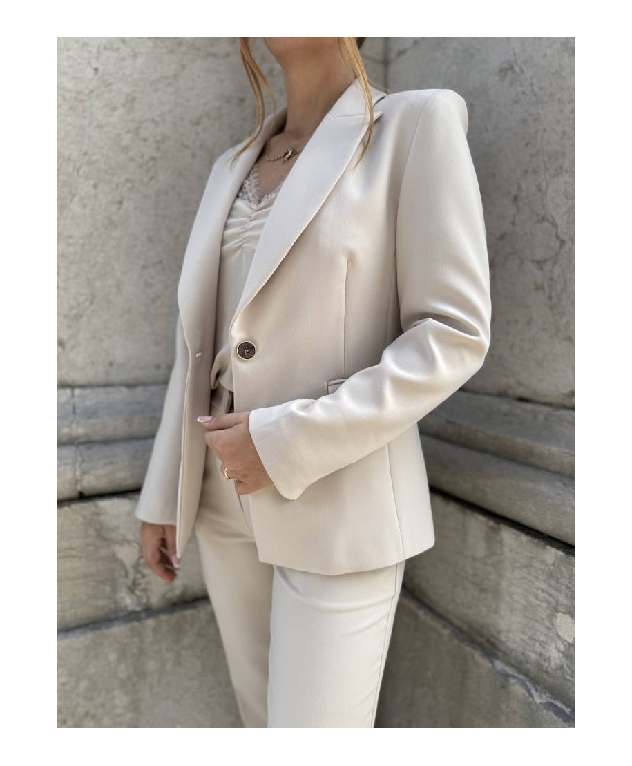 Tailleur basico con giacca sfiancata e pantalone dritto. Cinturino in raso tono su tono. Composizione: 17% viscosa, 6% elastan, 77% poliestere