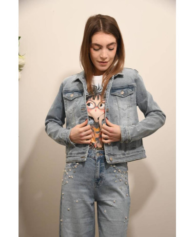 Giubbino jeans da donna iconico e intramontabile, un capo essenziale del guardaroba femminile. Realizzato in denim di cotone resistente ma confortevole, veste regolare e valorizza la silhouette. Il design classico con chiusura frontale con bottoni, tasche applicate sul petto con patta e lavaggio chiaro effetto vintage lo rende estremamente versatile e facile da abbinare. Perfetto sopra t-shirt stampate, top o abiti leggeri. Ideale per completare look casual, urban e daily wear. Composizione: 75% cotone, 23% poliestere, 2% elastan.