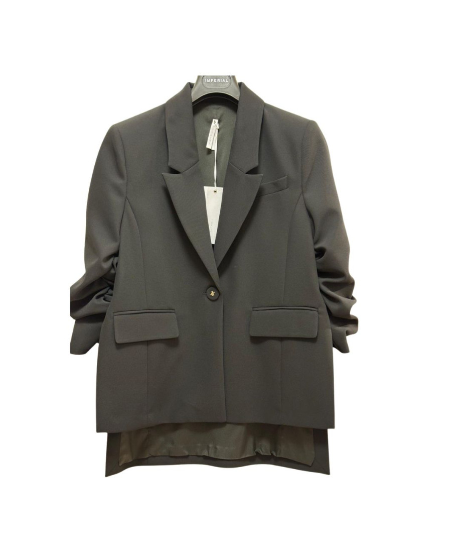 Eleganza disinvolta e dettagli ricercati definiscono questa giacca con maniche a 3/4 arricciate. Il taglio asimmetrico (lunga sul retro) e i profondi spacchi laterali donano movimento e un look contemporaneo. Completamente foderata, presenta una chiusura con bottone rivestito personalizzato con logo e pratiche tasche frontali. Le spalline leggermente imbottite donano struttura al capo. Un capo versatile e raffinato, ideale da indossare aperto o chiuso, perfetto per look da ufficio o per elevare il casual quotidiano. Maniche con drapeggio, bottone unico. Composizione: 100% poliestere.