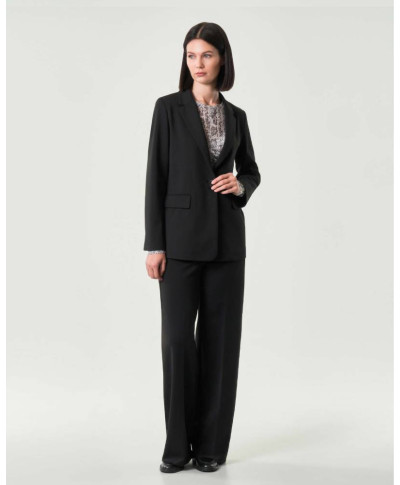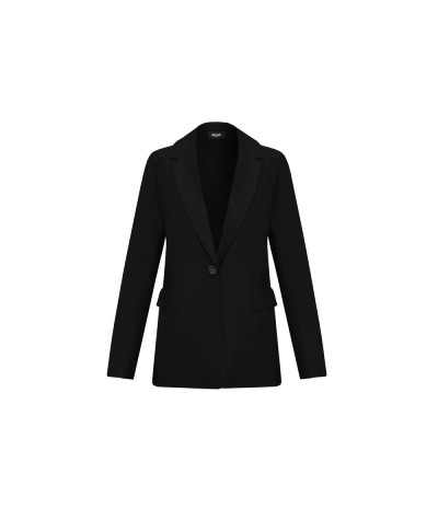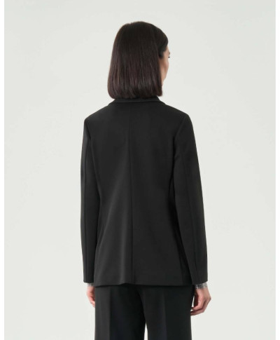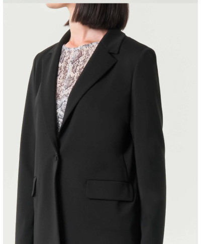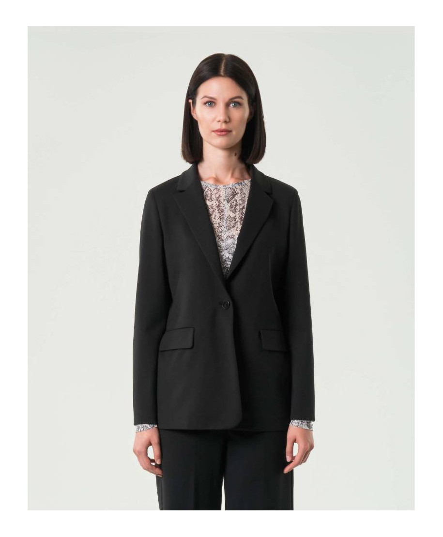Giacca di poliestere stretch, caratterizzata da linea dritta e collo con revers. Allacciatura frontale con bottone a vista, maniche lunghe, patte e tagli fianchetto sia davanti che dietro.
