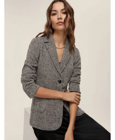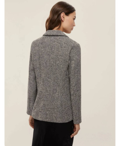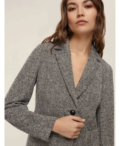 Giacca in stuoia con disegno resca in misto cotone stretch. Fit femminile con linea leggermente sfiancata. Scollo con rever. Chiusura con due bottoni a vista. Tasche applicate con impunture a vista.