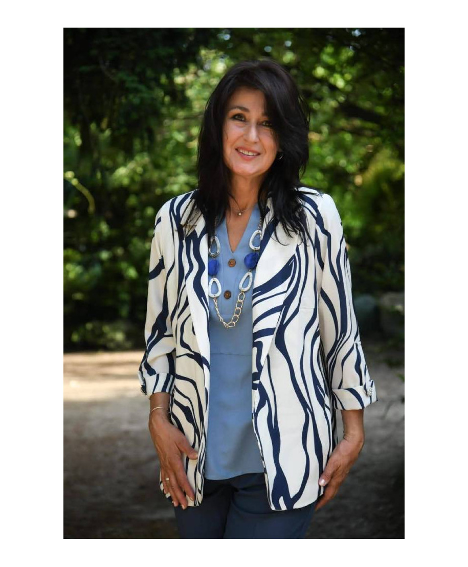 Blazer corto dalle linee ondulate e stilizzate con colletto a revers, bottoni dorati e maniche a 3/4 con risvolti. Un tessuto leggero e strutturato, adatto per un look primaverile, con un effetto visivo forte e alla moda. I bottoni dorati aggiungono un tocco di eleganza. Look chic e versatile, perfetto per un ambiente lavorativo smart casual o per un evento elegante all'aperto, con un tocco originale grazie alla stampa unica. Composizione: 95% poliestere, 5% elastan.