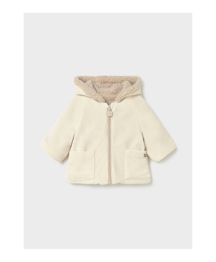 Cappotto manica raglan per neonato. Cappuccio con dettagli in pellicciotto. Chiusura centrale con cerniera. Morbida fodera interna in poliestere. Tasche funzionali nella parte anteriore. Si tratta di un articolo unisex versatile per le sue tonalitneutre e per la sua forma. Modello con design reversibile.