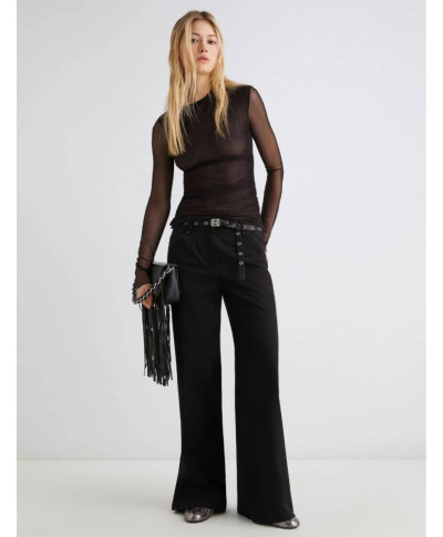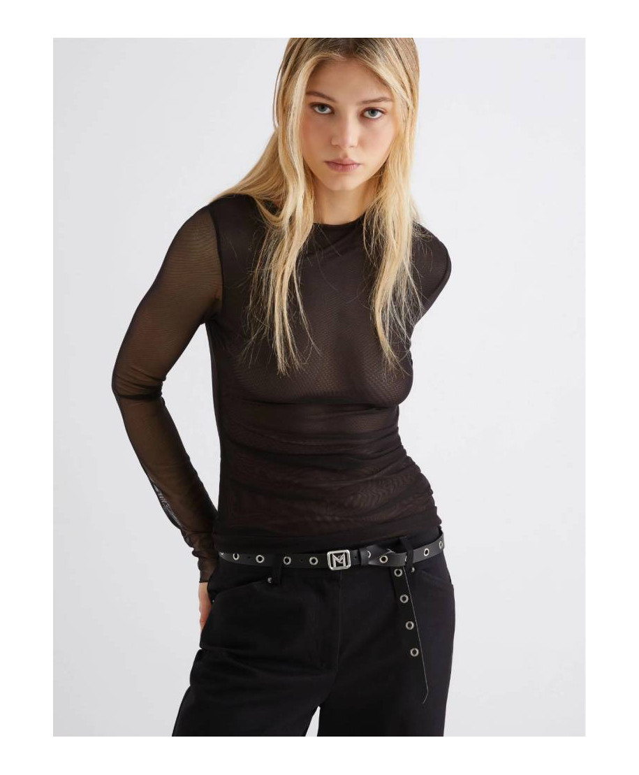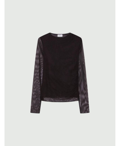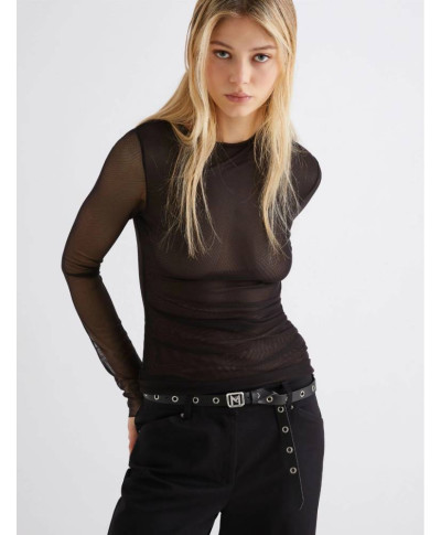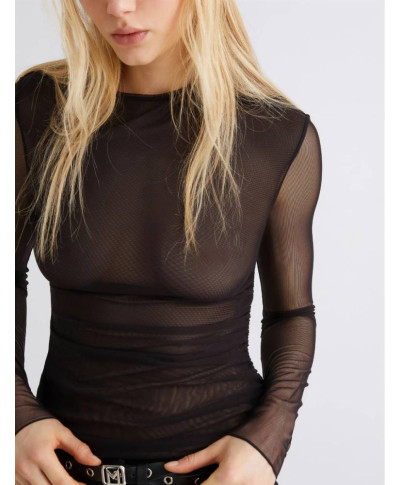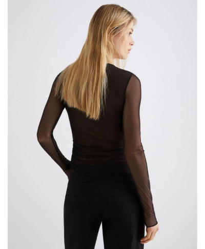 Tshirt in tulle stretch doppiato semi trasparente. Fit aderente. Scollo stondato. Motivo di arricci sul collo e sul fianco. Maniche lunghe.