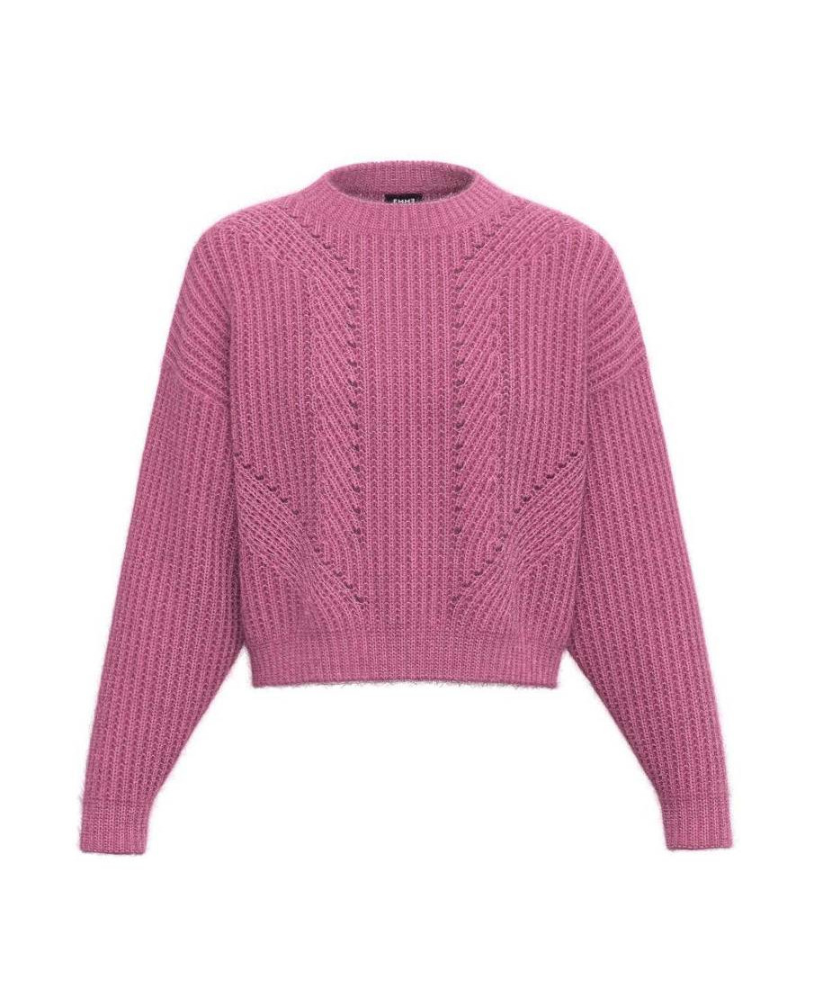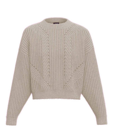Maglia in filato soft di misto alpaca. Fit morbido. Scollo a giro con spalla scesa. Capo lavorato con punto pannocchia e calature sul davanti. Polsi, collo e fondo bordati con costine.