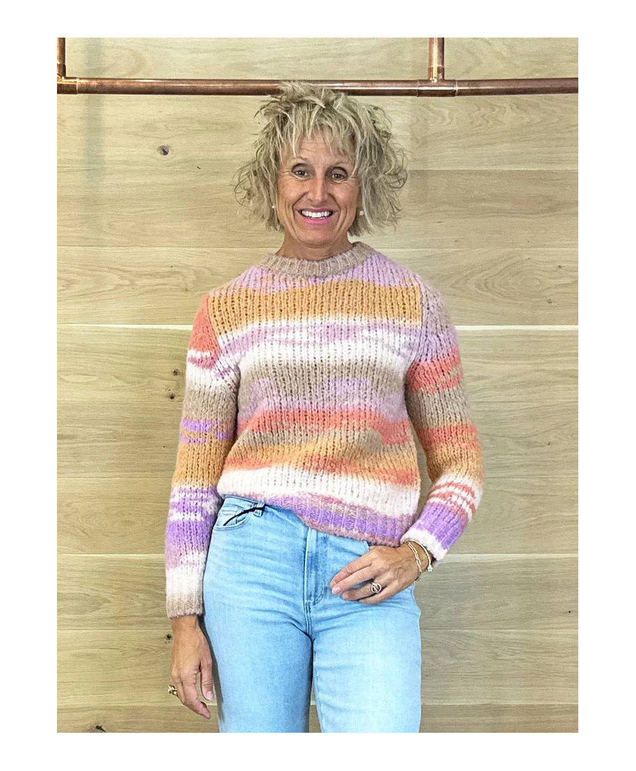 Maglia in filato di misto lana e alpaca fantasia. Fit boxy. Scollo a giro. Dettaglio a costine su collo, polso e fondo capo.