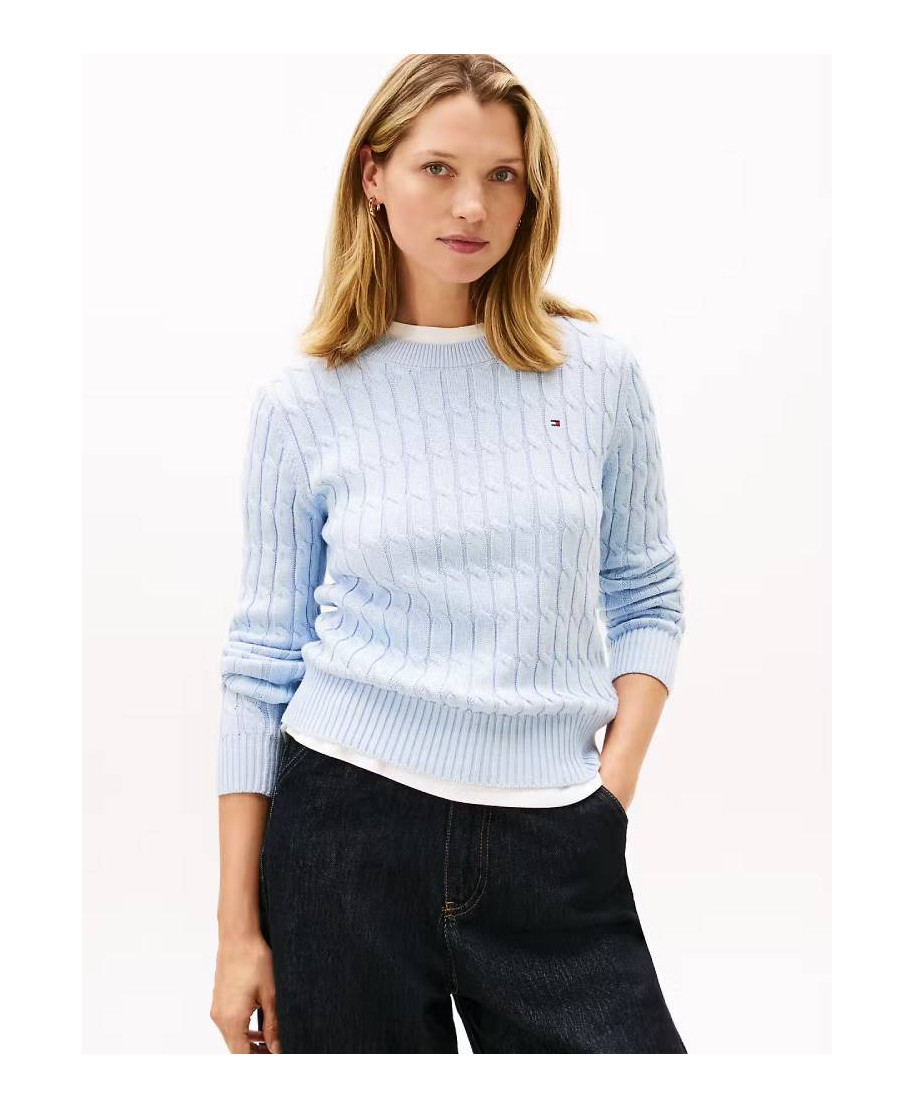 Maglia donna in cotone medio peso con lavorazione cable firmata Tommy Hilfiger, ideale per la stagione Autunno Inverno 2026. Questo maglione caldo e avvolgente offre maggiore struttura e comfort nelle giornate piu' fresche. Perfetto per outfit casual eleganti, abbinato a denim o pantaloni in tessuto. Design ricercato e qualita' premium per uno stile femminile e contemporaneo.