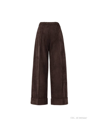 Pantalone cropped a gamba larga dal design essenziale e versatile, realizzato in pregiato velluto a coste. La vita è dotata di un elastico morbido che assicura una vestibilità confortevole. Il fondo è rifinito con un risvolto cucito, mentre la piega stirata conferisce al modello un tocco raffinato, bilanciando perfettamente funzionalità e stile. Le tasche laterali, posizionate con cura, mantengono una linea pulita e slanciata senza aggiungere volume ai fianchi.