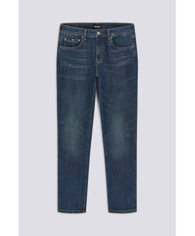 Jeans 5 tasche slim fit realizzato in denim autentico comfort 13.00 OZ, con lavaggio medium dark blue con baffatura 3d. Pulito, versatile, essenziale: un capo iconico che attraversa le stagioni senza perdere identit Perfetto per chi cerca qualit vestibilite carattere in un solo jeans.