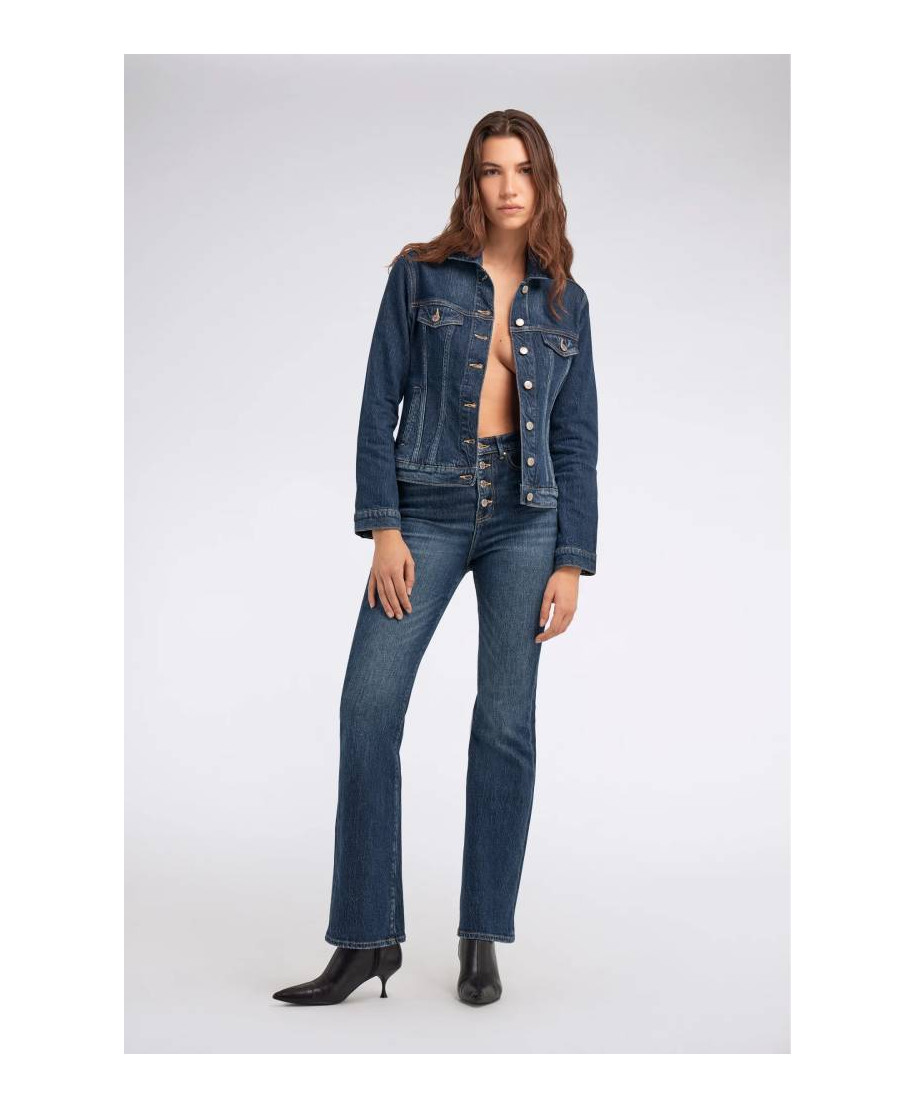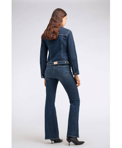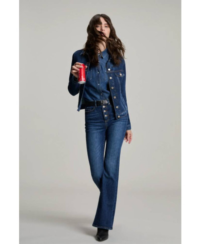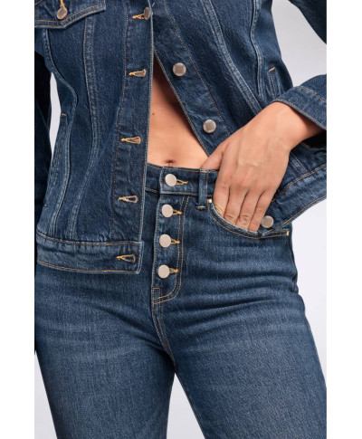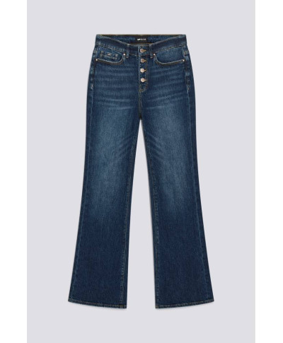 Jeans flare fit in tessuto comfort blue indaco dallaspetto autentico 13.80 OZ. Il lavaggio medio/scuro con pomice e le abrasioni su tasche e fondo richiamano lestetica rro con un twist contemporaneo. La patta con bottoni a vista firma il design. Perfetti in combo con liconico giubbino in denim New Warming.