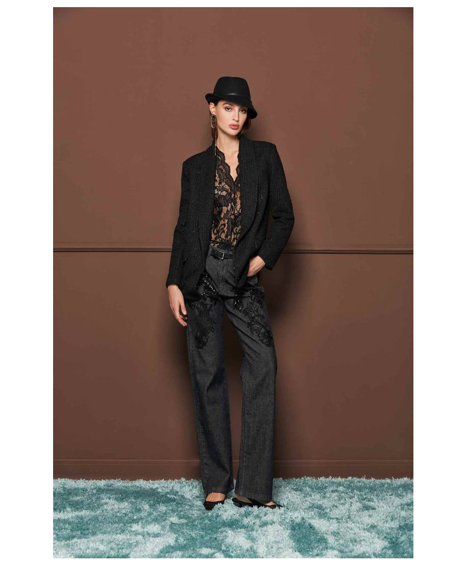 Jeans larghi con decorazioni tono su tono in paillettes.