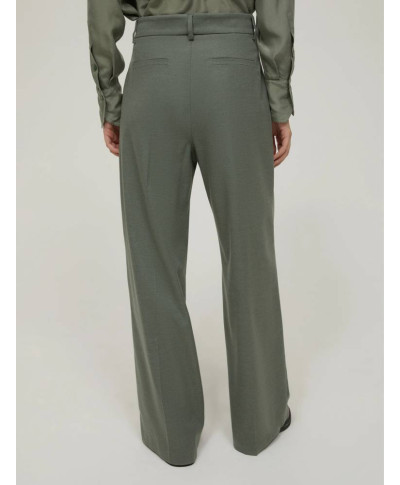 I pantaloni sartoriali dispirazione maschile entrano in un mood rilassato e si rivelano molto femminili. Tessuto principale contenente una percentuale di poliestere riciclato superiore al 50%. Twill in blend di lana stretch a effetto melange. Finitura smerigliata a mano calda. Gamba ampia e diritta, vita regolare con passanti. Doppie pieghe sul davanti, piega stirata. Tasche alla francese davanti, a filo sul retro. Chiusura nascosta con ganci e zip. Composizione: 51% poliestere, 27% viscosa, 20% lana, 2% elastan.