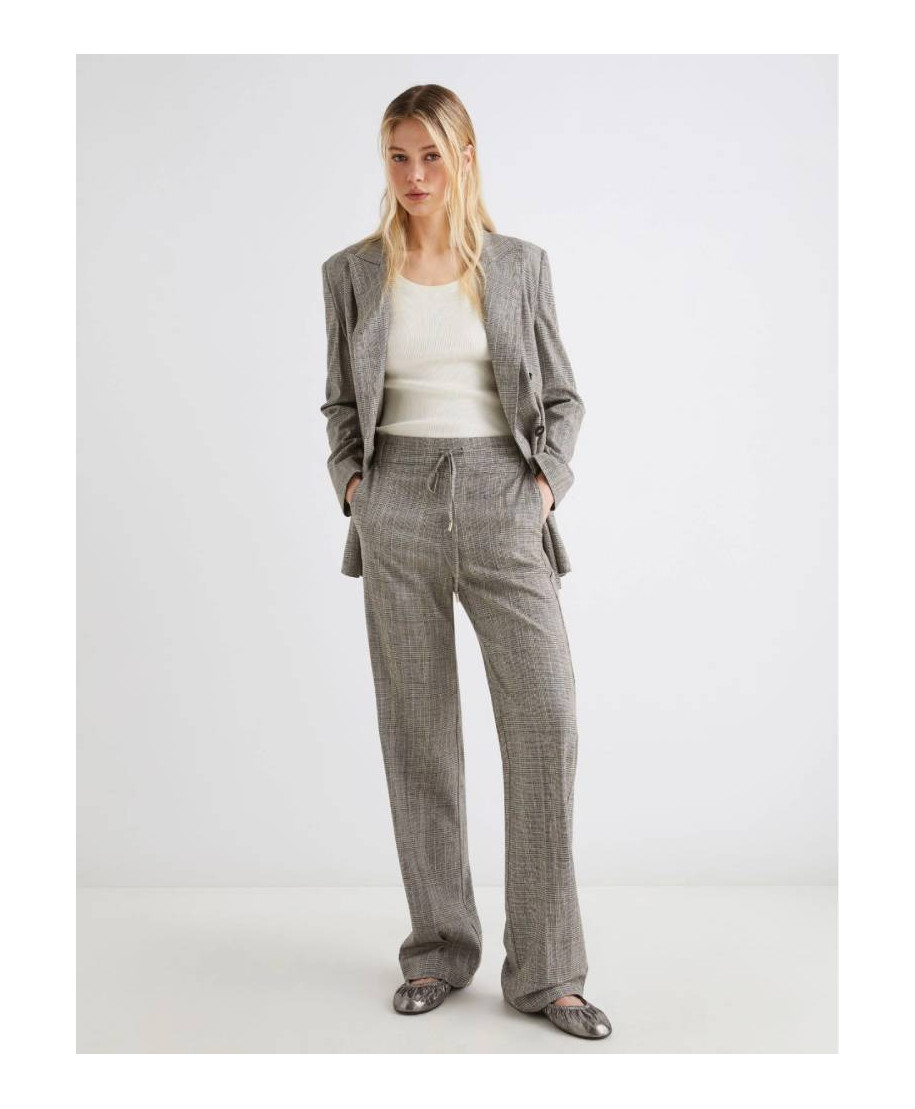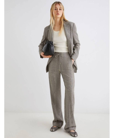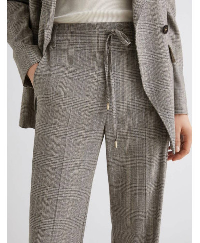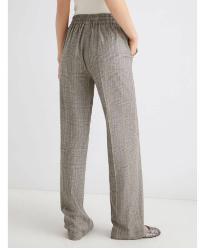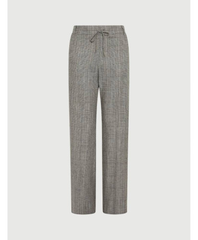 Pantalone in saglia di misto lana e viscosa stretch con effetto resca. Fit morbido. Chiusura con coulisse e inserto elastico sul retro della vita. Piega stirata fronte e retro. Tasche laterali alla francese.