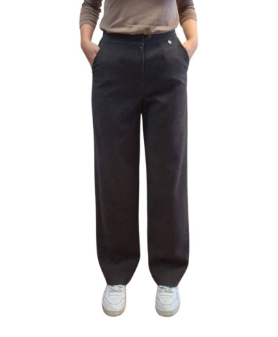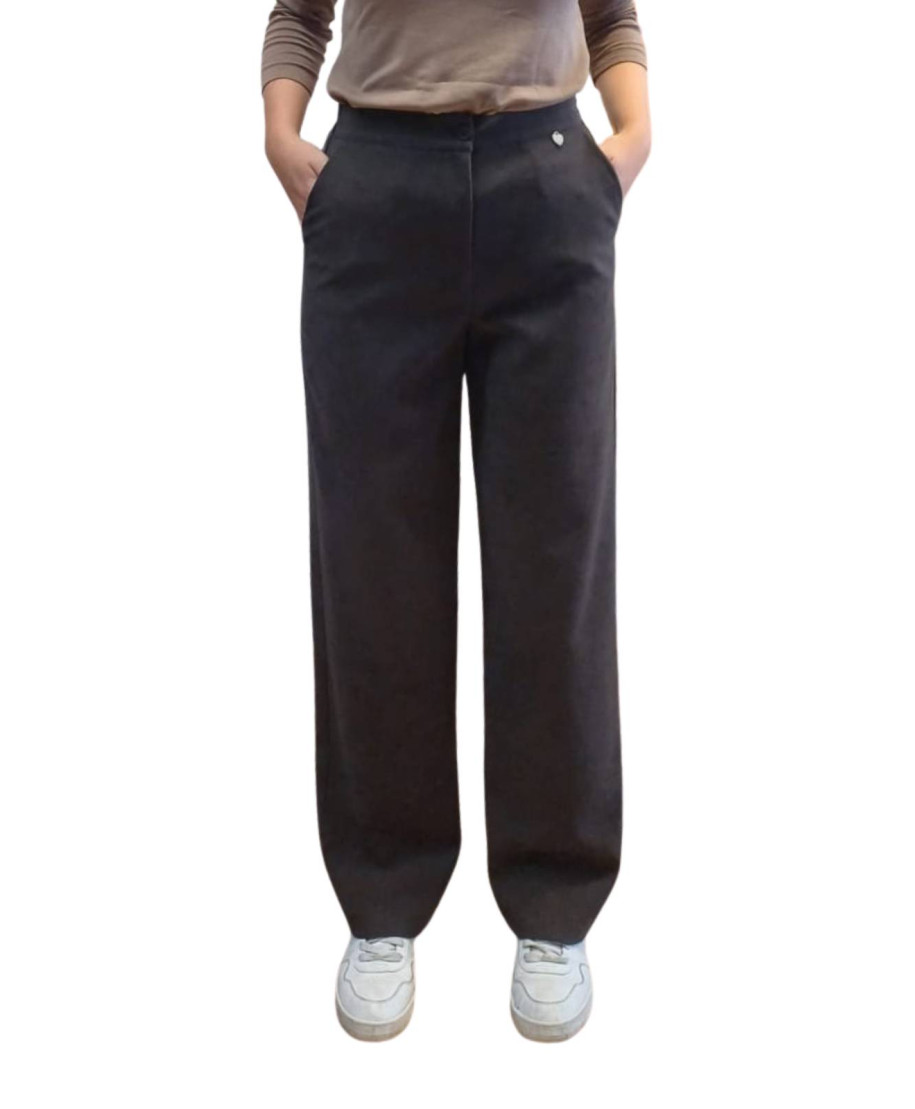 Pantalone simil velluto a gamba dritta con tasca alla francese ed elastico in vita. Composizione: 97% poliestere, 3% elastan.