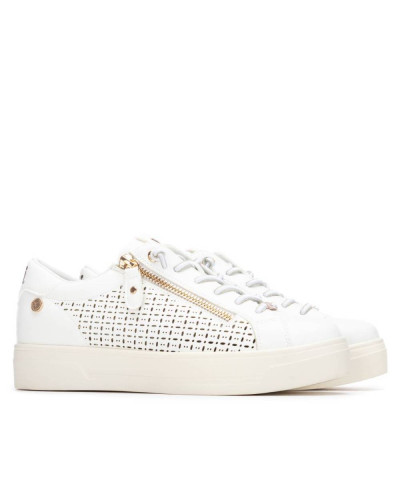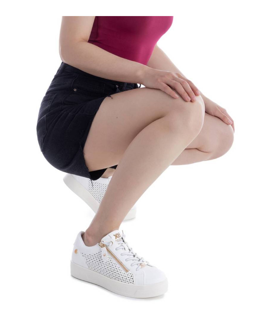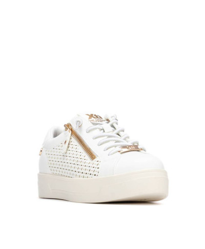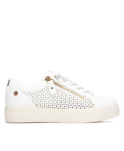 Scarpa da donna di Xti. Realizzata in materiale similpelle con un grazioso design traforato che aggiunge un tocco decorativo e femminile. Presenta una cerniera laterale per indossarla e toglierla facilmente e un dettaglio moderno. La suola piatta e robusta, in stile casco, garantisce un comfort ottimale per l'uso quotidiano. Presenta inoltre una suola antiscivolo per una maggiore sicurezza a ogni passo. Questo modello ha ricevuto la certificazione vegana da PETA (l'organizzazione mondiale per i diritti degli animali).