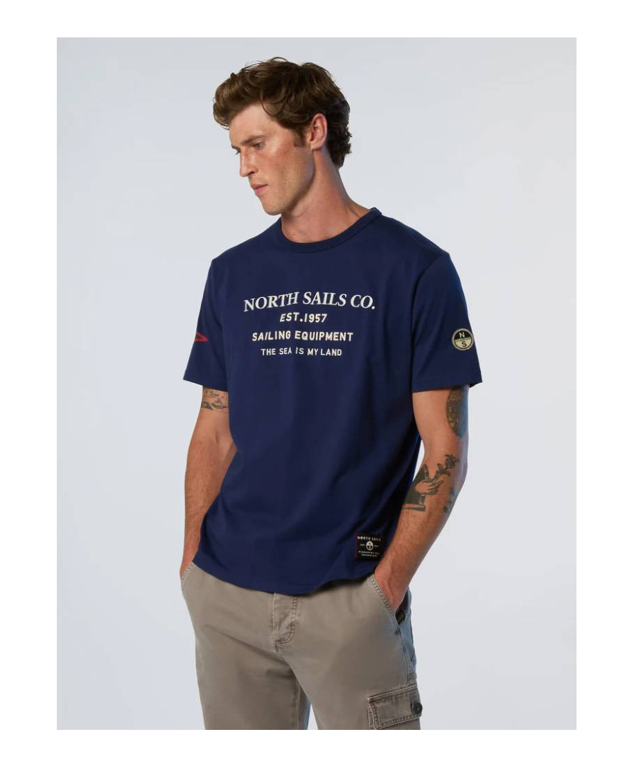Tshirt ispirata allarchivio storico North Sails. Il modello realizzato in jersey di cotone compatto ed rifinito con la stampa sul davanti che omaggia la cittdi Newport. L'occhiello in metallo applicato al fondo un dettaglio tipico delle vele.