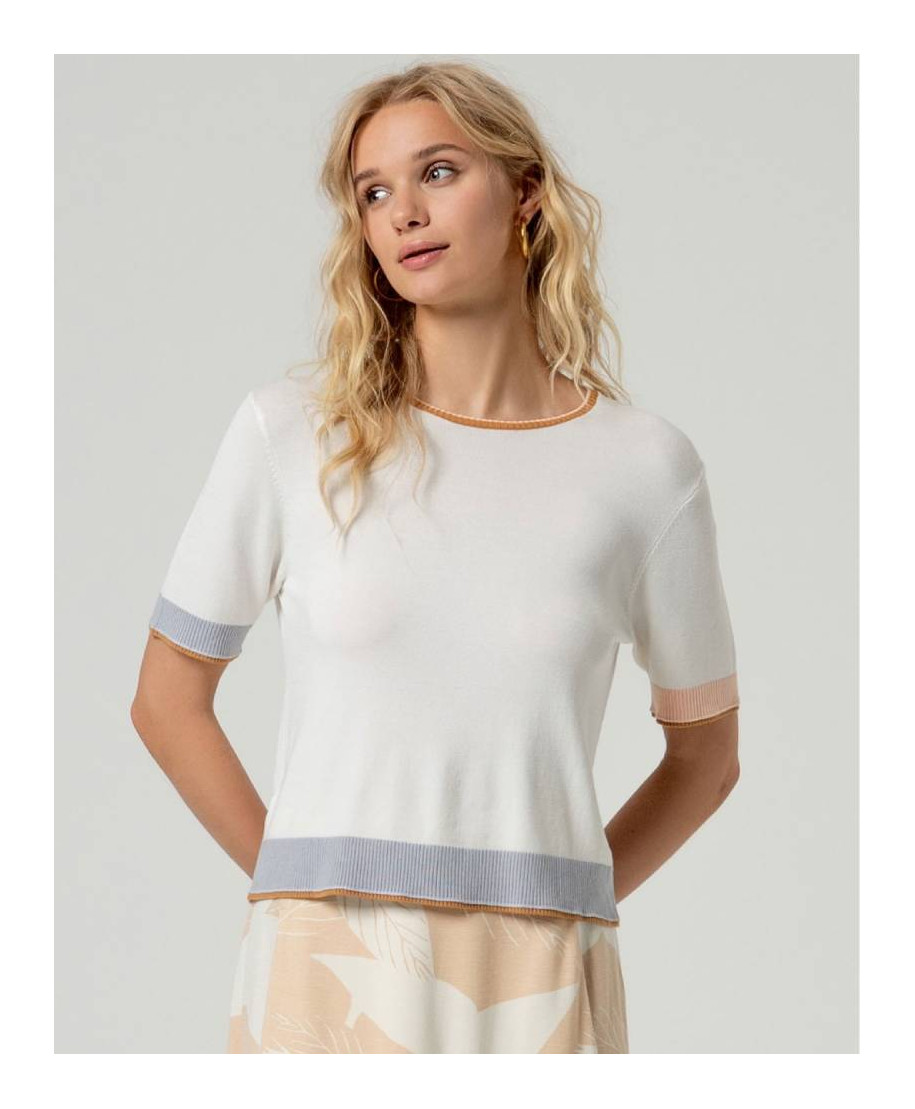 Maglia donna con scollo tondo e maniche corte. Pensato per mezze stagioni e abbinamenti semplici.