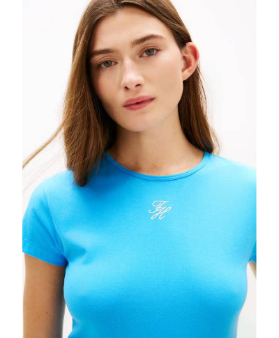 T shirt donna slim con logo script frontale dal design fresco e contemporaneo. La linea aderente crea un look femminile e dinamico. Perfetta per outfit casual chic primaverili.
