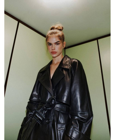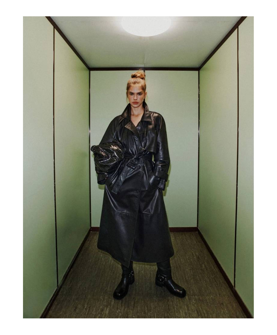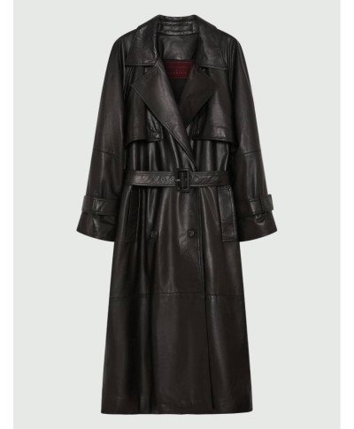 Trench in pelle imbottita. Modello appartenente alla speciale collezione Marella Codesign in collaborazione con Stella Maxwell. Fit dritto oversize. Scollo con rever e doppie impunture. Chiusura doppiopetto con bottoni e cintura dalla fibbia ricoperta. Manica raglan con alamari e bottoni al polso.
