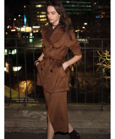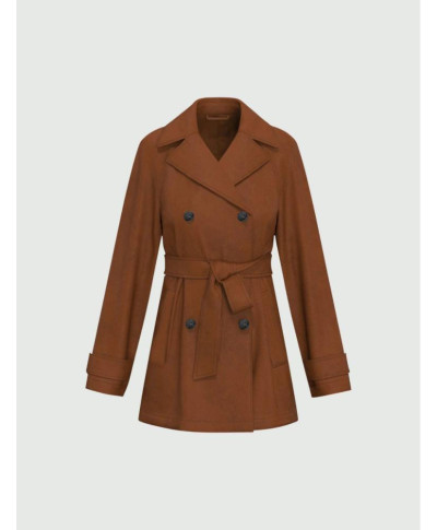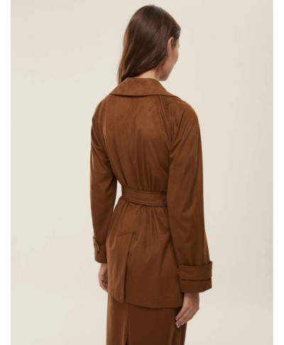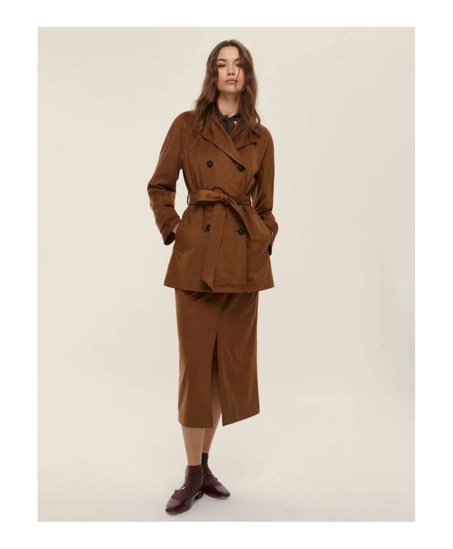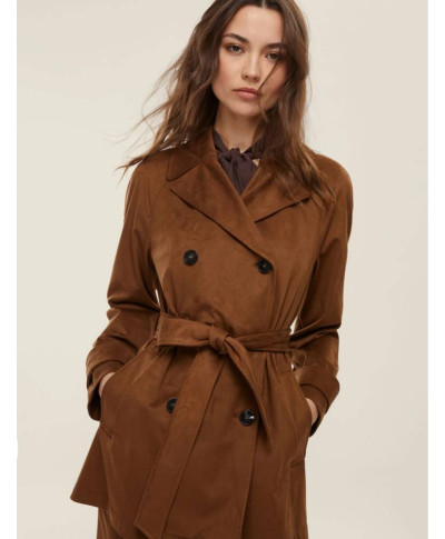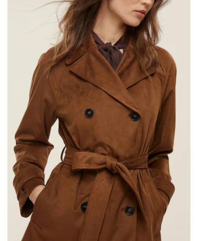 Trench in jersey dalla mano liscia e morbida. Fit dritto. Collo con rever. Chiusura doppiopetto con bottoni e cintura. Maniche lunghe con taglio raglan con alamari ai polsi. Tasche laterali con filetto.