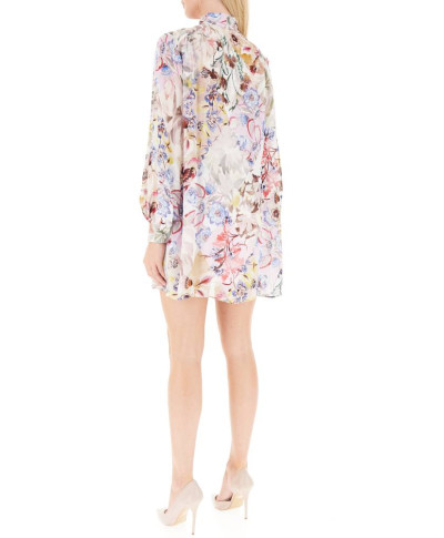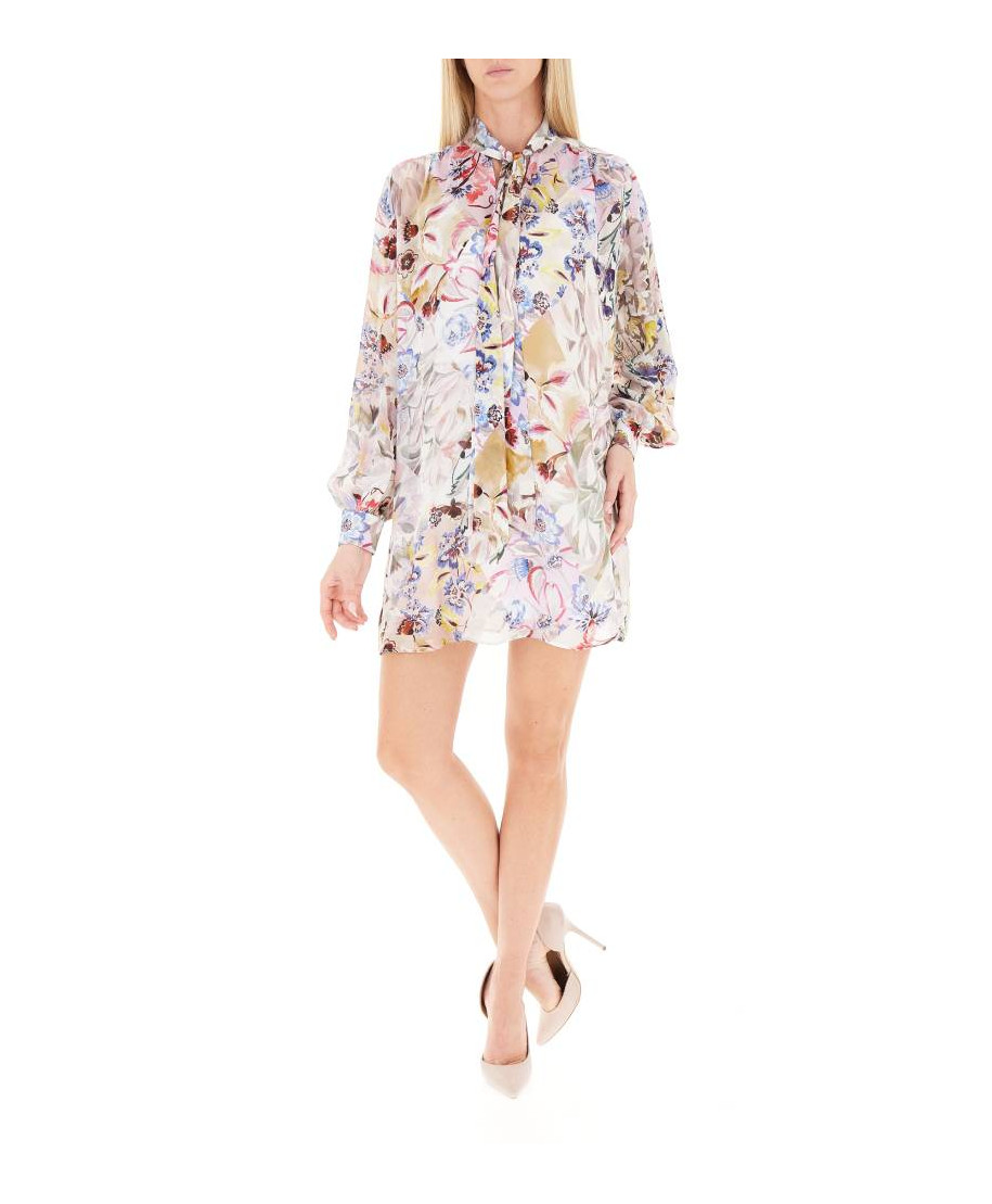 Abito in georgette di viscosa stampata e foderata in crepe de Chine. Fit regolare. Collo alla coreana con fusciacca da annodare. Abbottonatura a vista. Manica lunga con sbuffo al polso e bottoni ricoperti.
