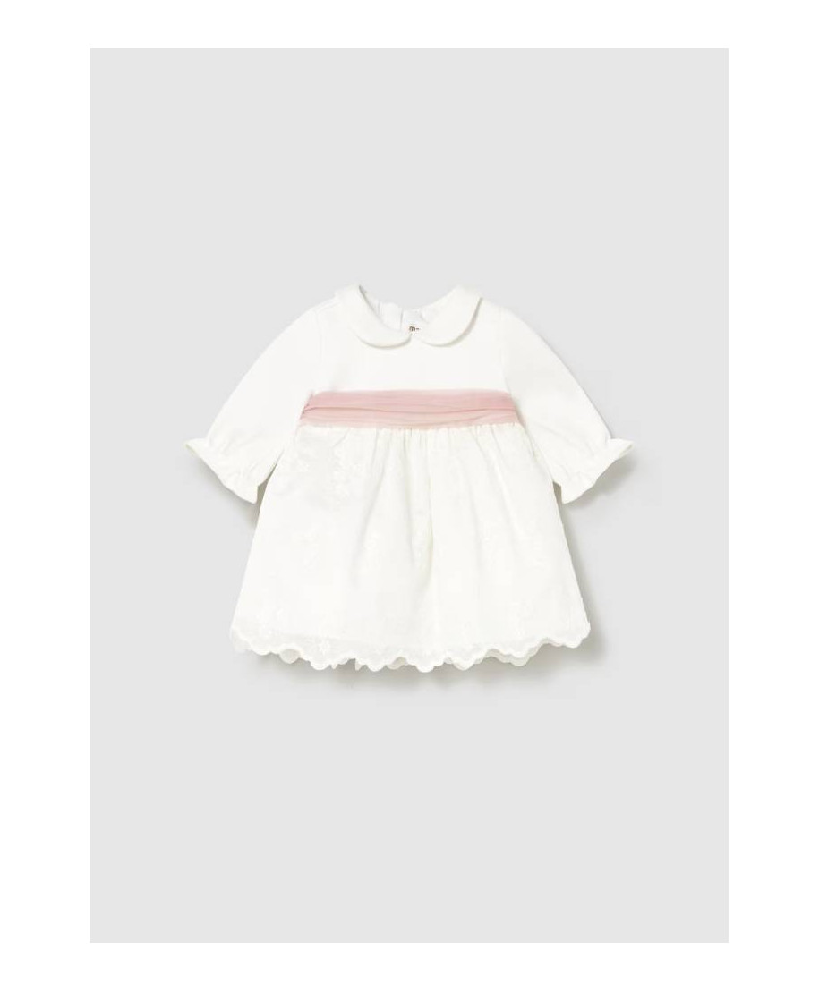 Vestito manica lunga per neonato. Colletto beb Apertura posteriore con cerniera invisibile. Modello con fodera interna. Modello con riccio. Elementi decorativi: ricami, finta fusciacca in vita.