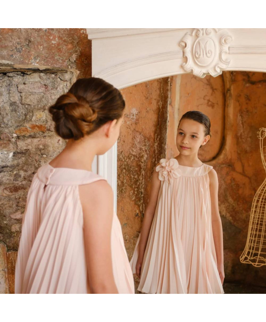 Abito da bambina plissettato con chiusura sul retro e bottoncini in madreperla. Dettaglio spilla con fiore removibile. Elegante dal design raffinato e ideale per cerimonie ed eventi speciali. Composizione: 100% poliestere.