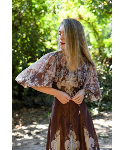 Vestito in viscosa a fantasia con cintura in vita e maniche a sbuffo. Composizione: 80% viscosa, 20% poliestere.