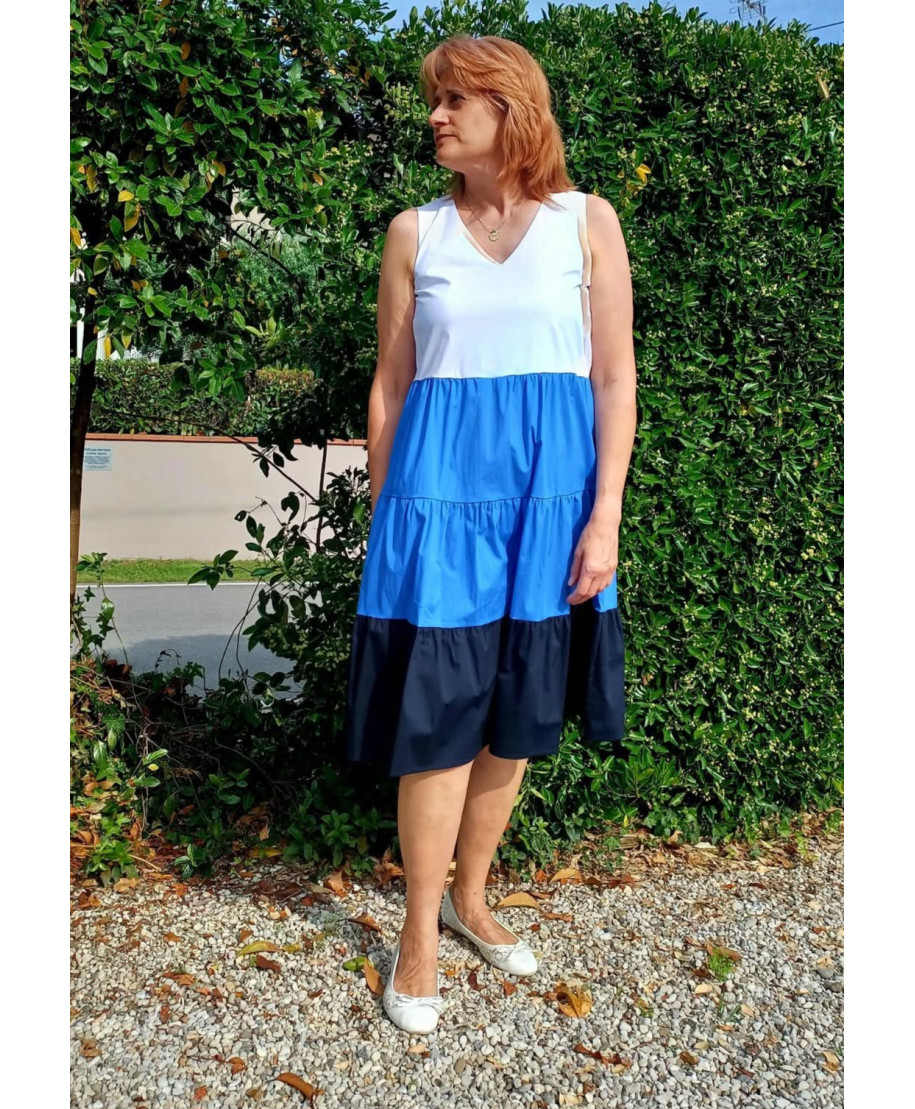 Abito smanicato a balze. Composizione: 97% cotone, 3% elastan.