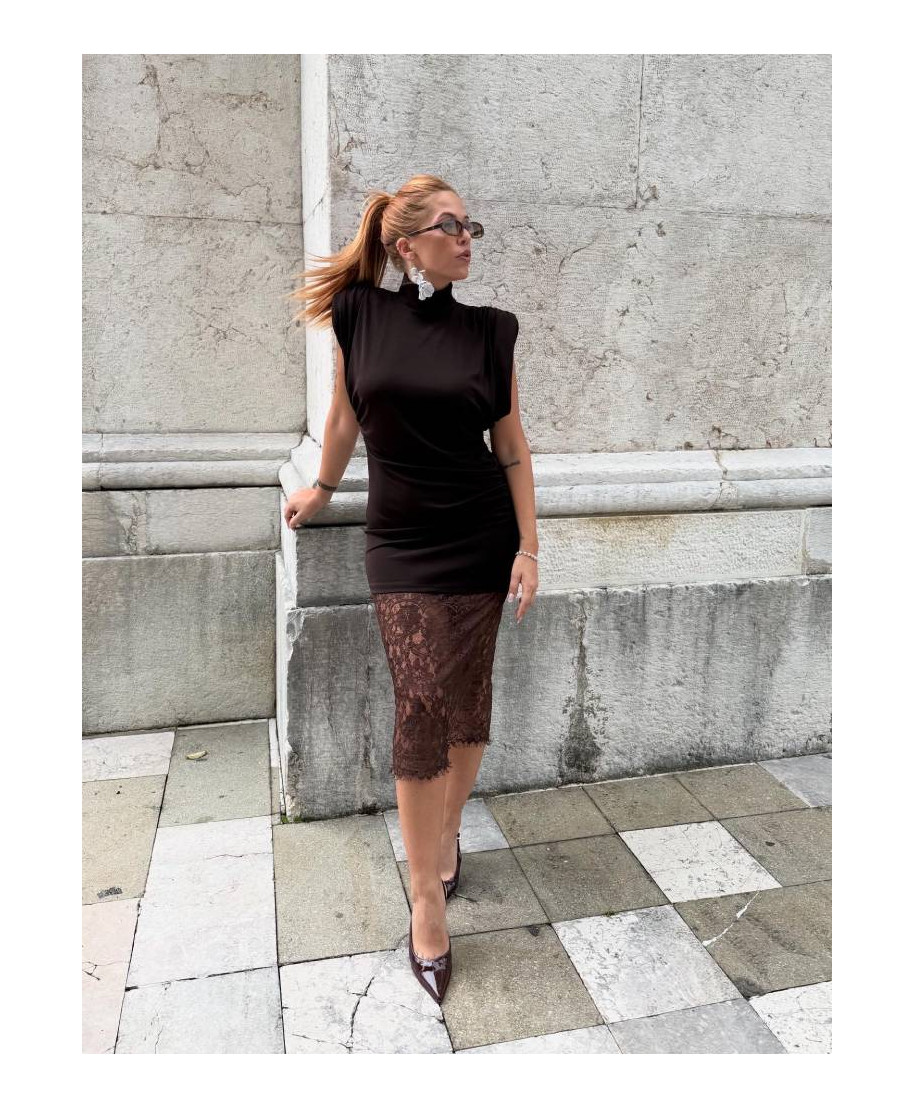 Abito tubino con spalle imbottite, collo alto e fondo con pizzo in trasparenza. Cerniera sul retro. Composizione: 92% poliestere, 8% elastan