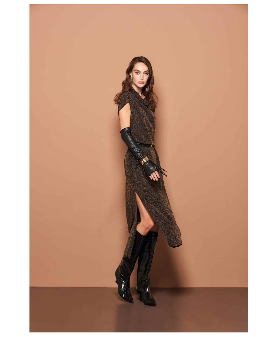 Abito smanicato in lurex con colletto morbido e spacchi laterali, perfetto per le tue serate formali e informali.